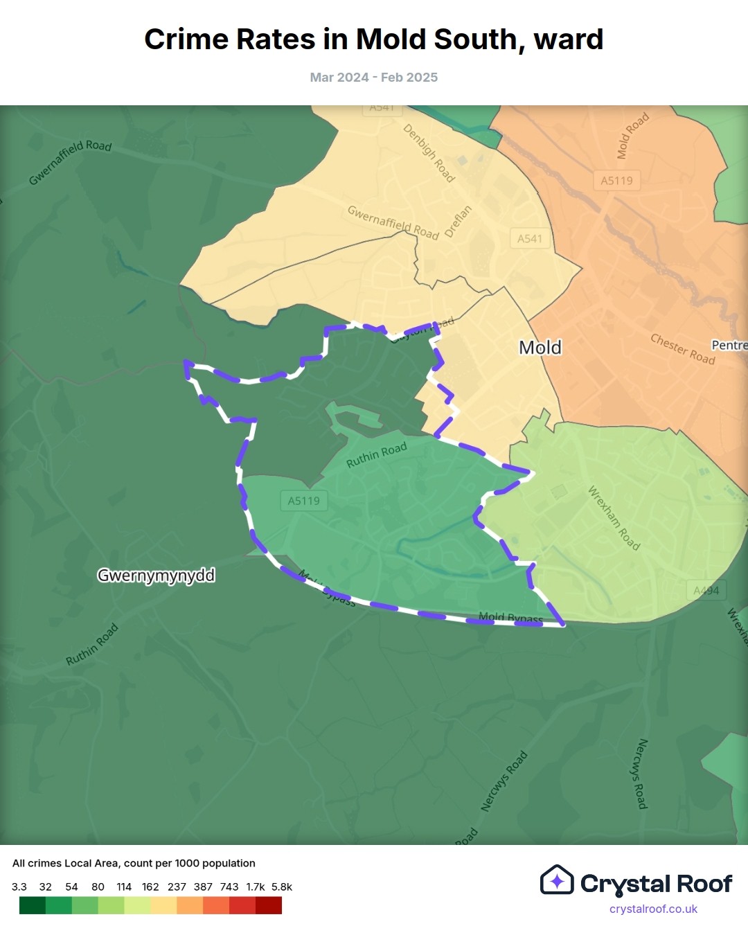 Mold South, (ward) includes areas with the following crime ratings (see map):