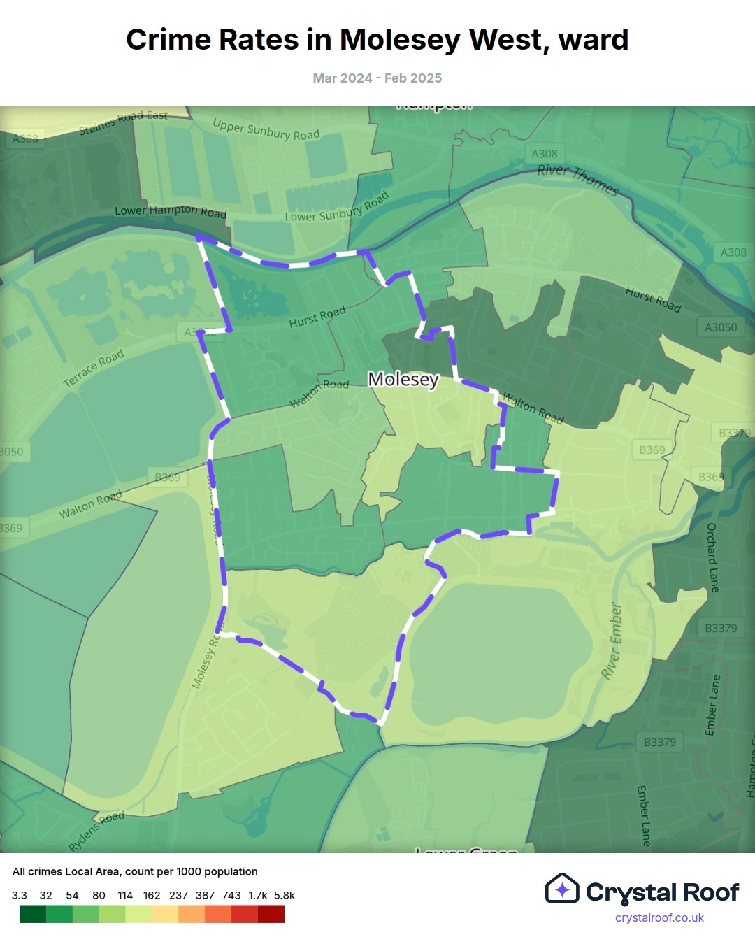 Molesey West, (ward) includes areas with the following crime ratings (see map):