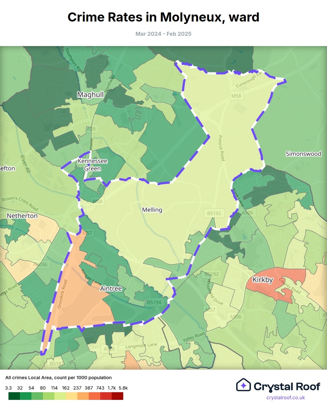 Molyneux (ward) is located within Sefton (borough). Annual total crime rate in Sefton (borough) is 86.3 crimes per thousand resident population, which can be rated as 4 out of 10 or low crime level compared to other local authority districts in England and Wales.