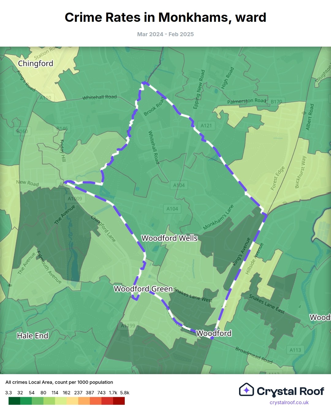 Monkhams, (ward) includes areas with the following crime ratings (see map):