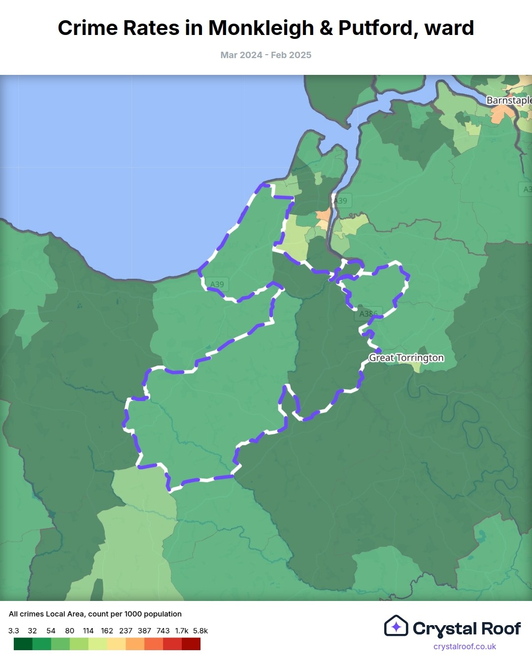 Monkleigh & Putford, (ward) includes areas with the following crime ratings (see map):