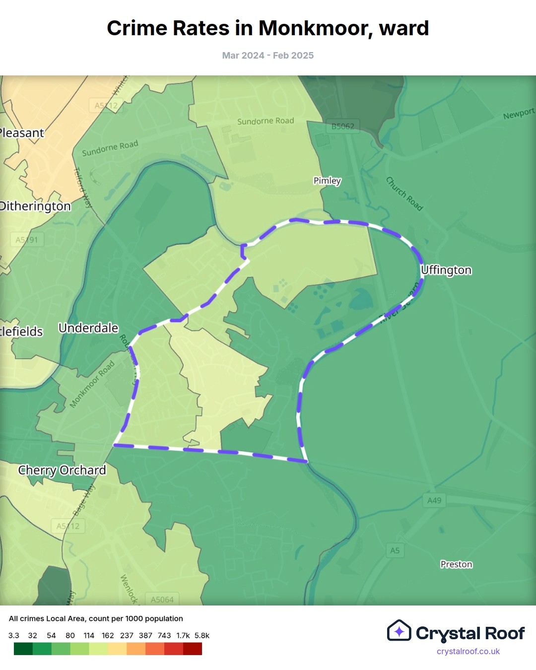 Monkmoor, (ward) includes areas with the following crime ratings (see map):