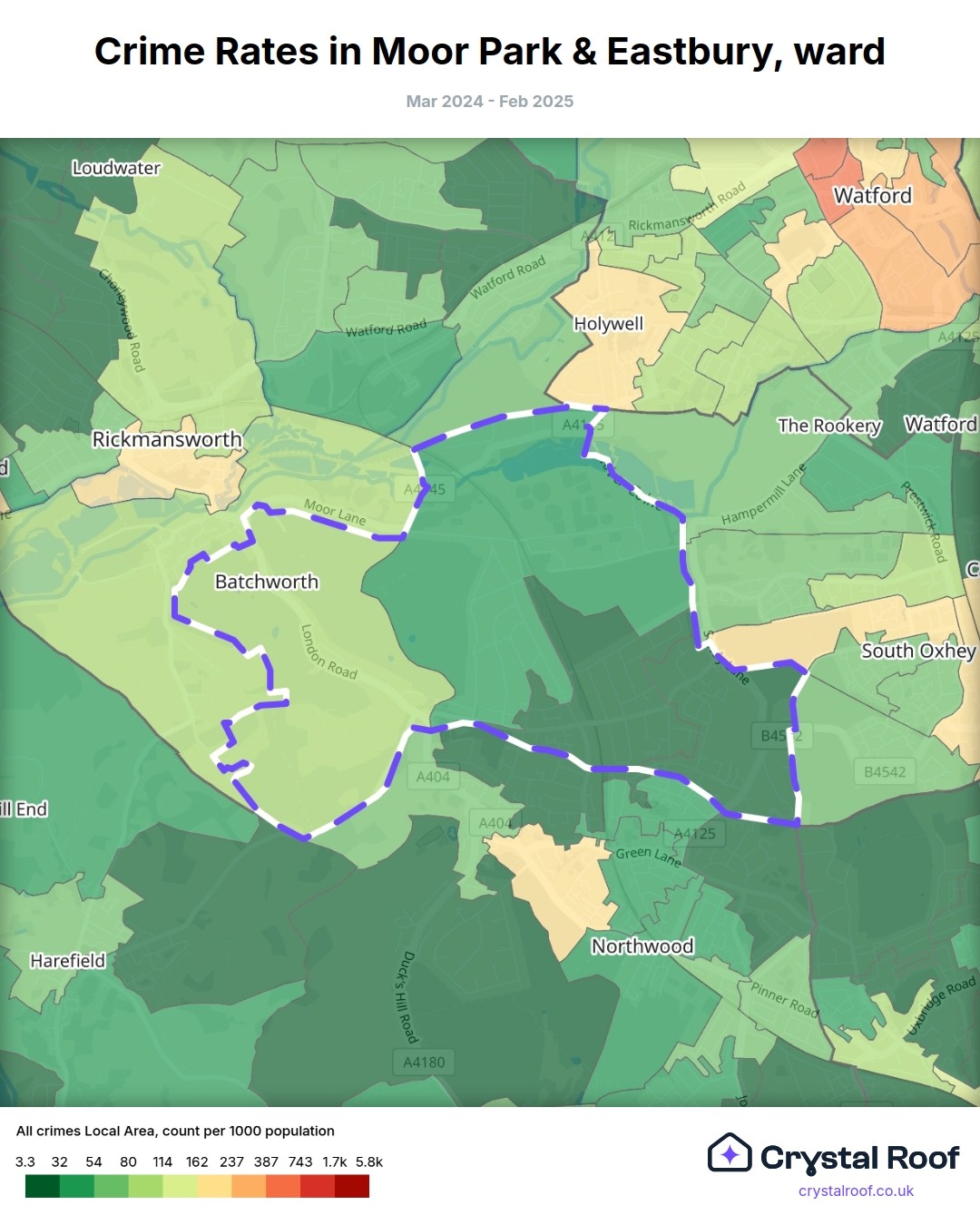 Moor Park & Eastbury, (ward) includes areas with the following crime ratings (see map):