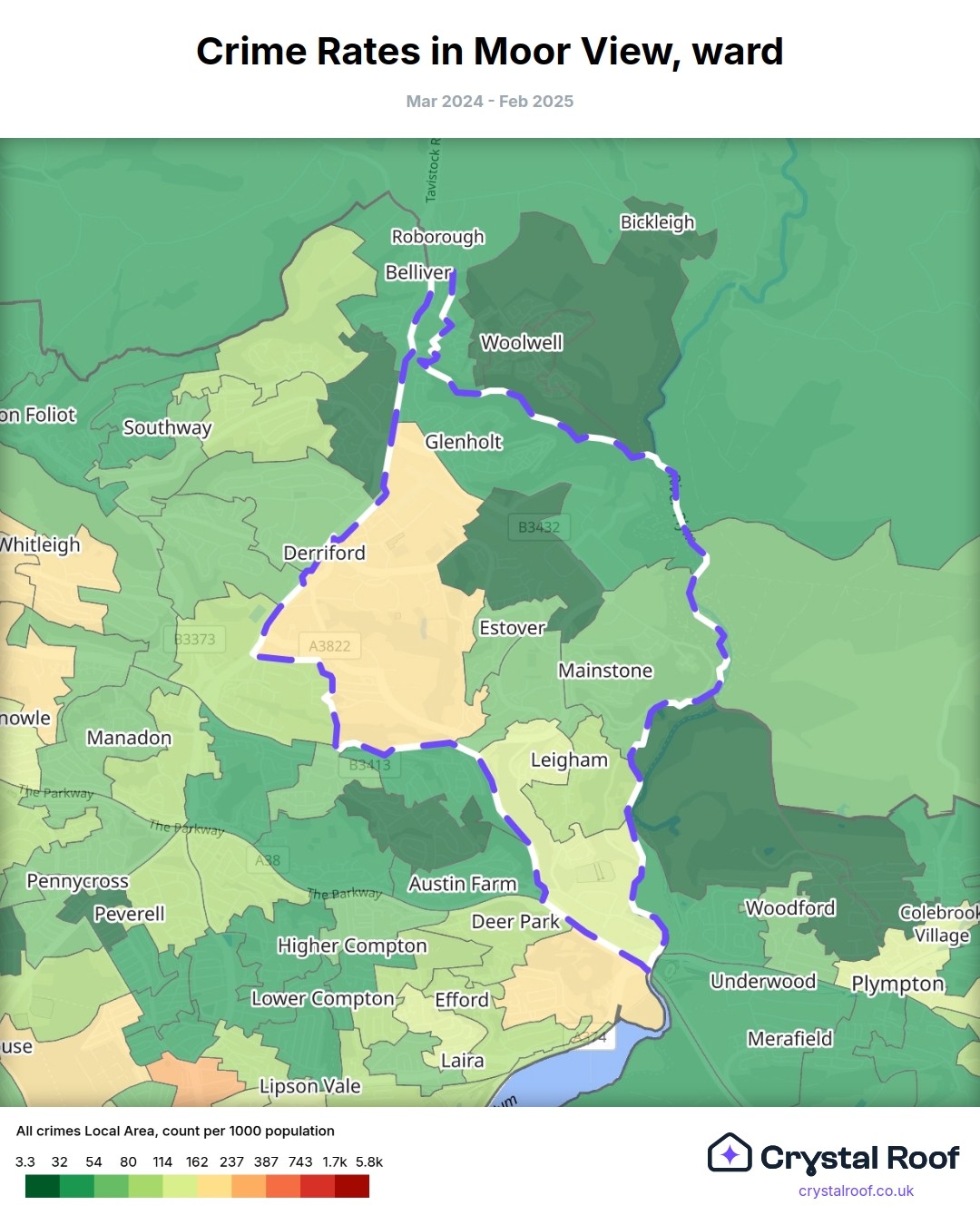 Moor View (ward) is located within Plymouth (borough). Annual total crime rate in Plymouth (borough) is 114 crimes per thousand resident population, which can be rated as 5 out of 10 or medium crime level compared to other local authority districts in England and Wales.