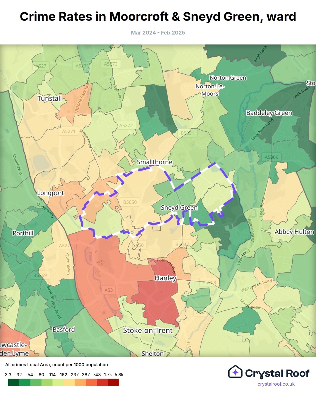 Moorcroft & Sneyd Green, (ward) includes areas with the following crime ratings (see map):