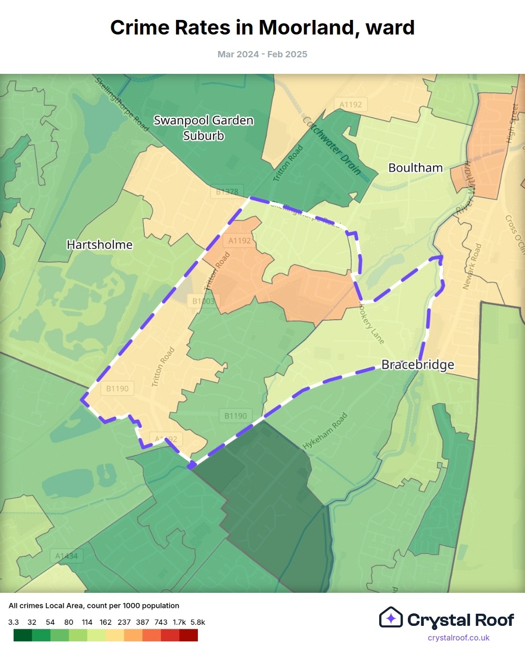 Moorland (ward) is located within Lincoln (borough). Annual total crime rate in Lincoln (borough) is 158 crimes per thousand resident population, which can be rated as 7 out of 10 or high crime level compared to other local authority districts in England and Wales.