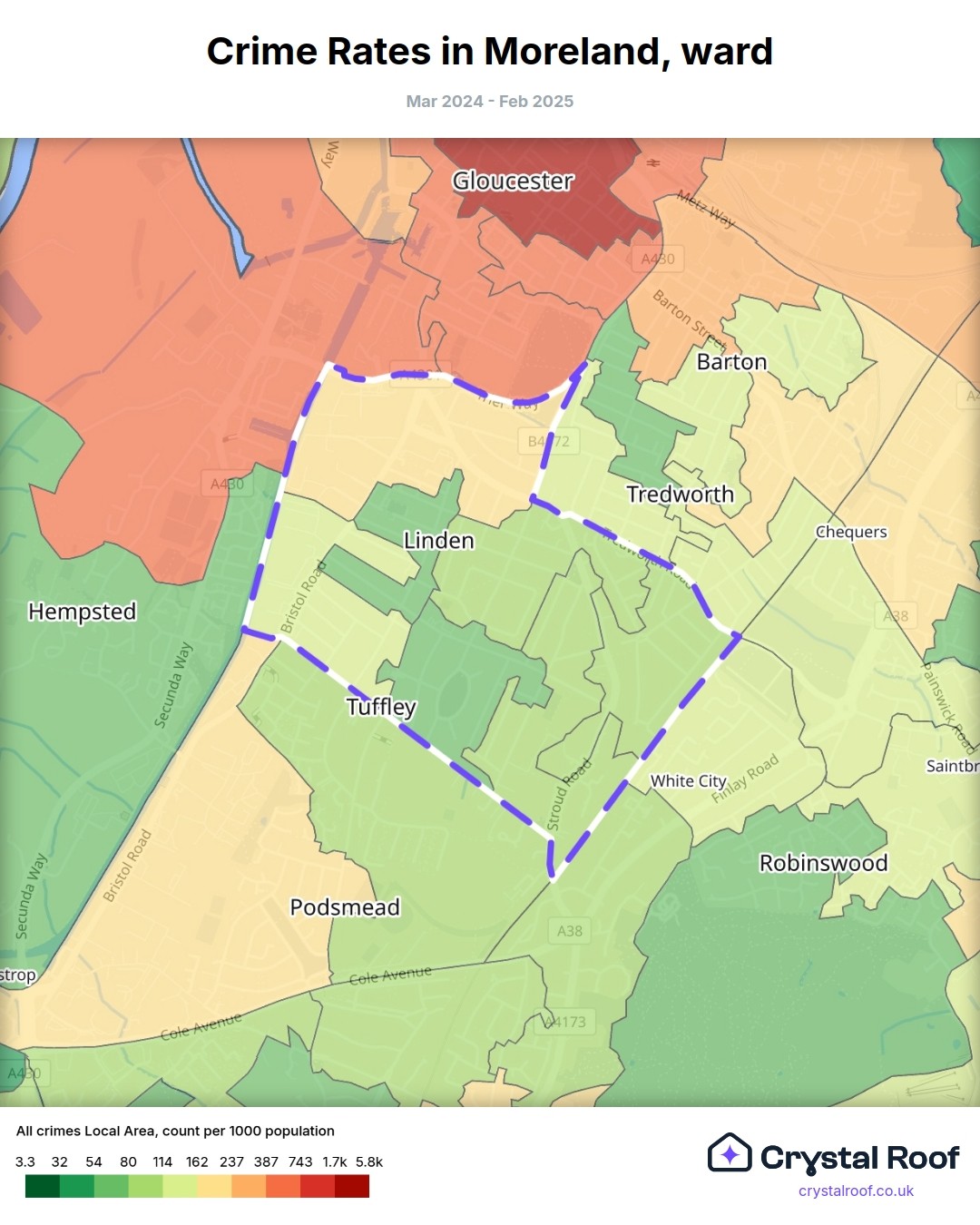 Moreland (ward) is located within Gloucester (borough). Annual total crime rate in Gloucester (borough) is 142 crimes per thousand resident population, which can be rated as 7 out of 10 or high crime level compared to other local authority districts in England and Wales.