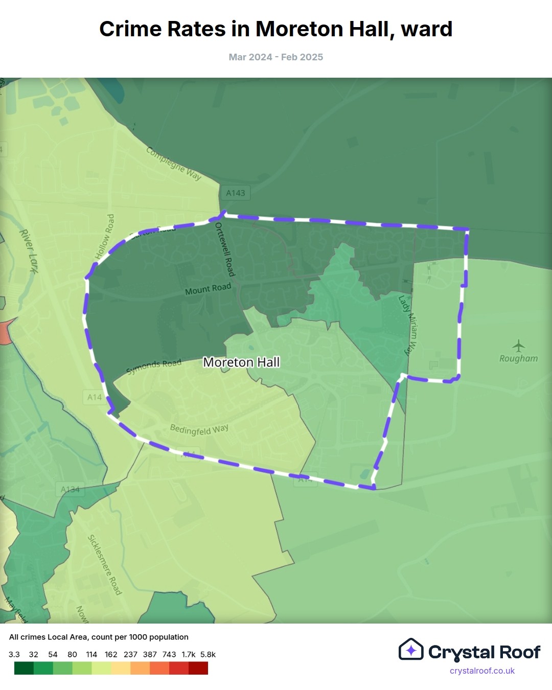 Moreton Hall, (ward) includes areas with the following crime ratings (see map):