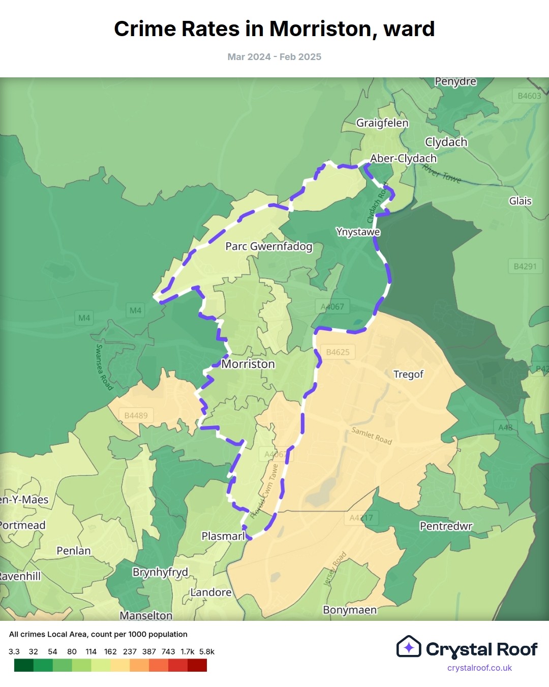 The figures in grey indicate the relative ratings of Morriston (ward) for a specific crime type compared to other wards in England and Wales.
