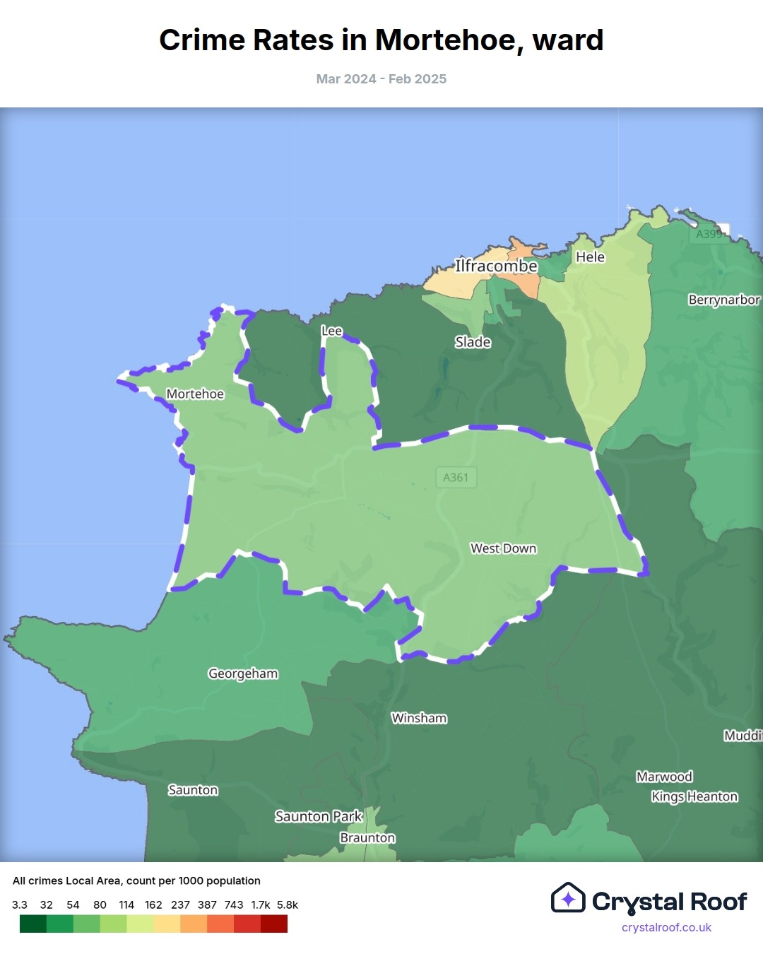 Mortehoe, (ward) includes areas with the following crime ratings (see map):