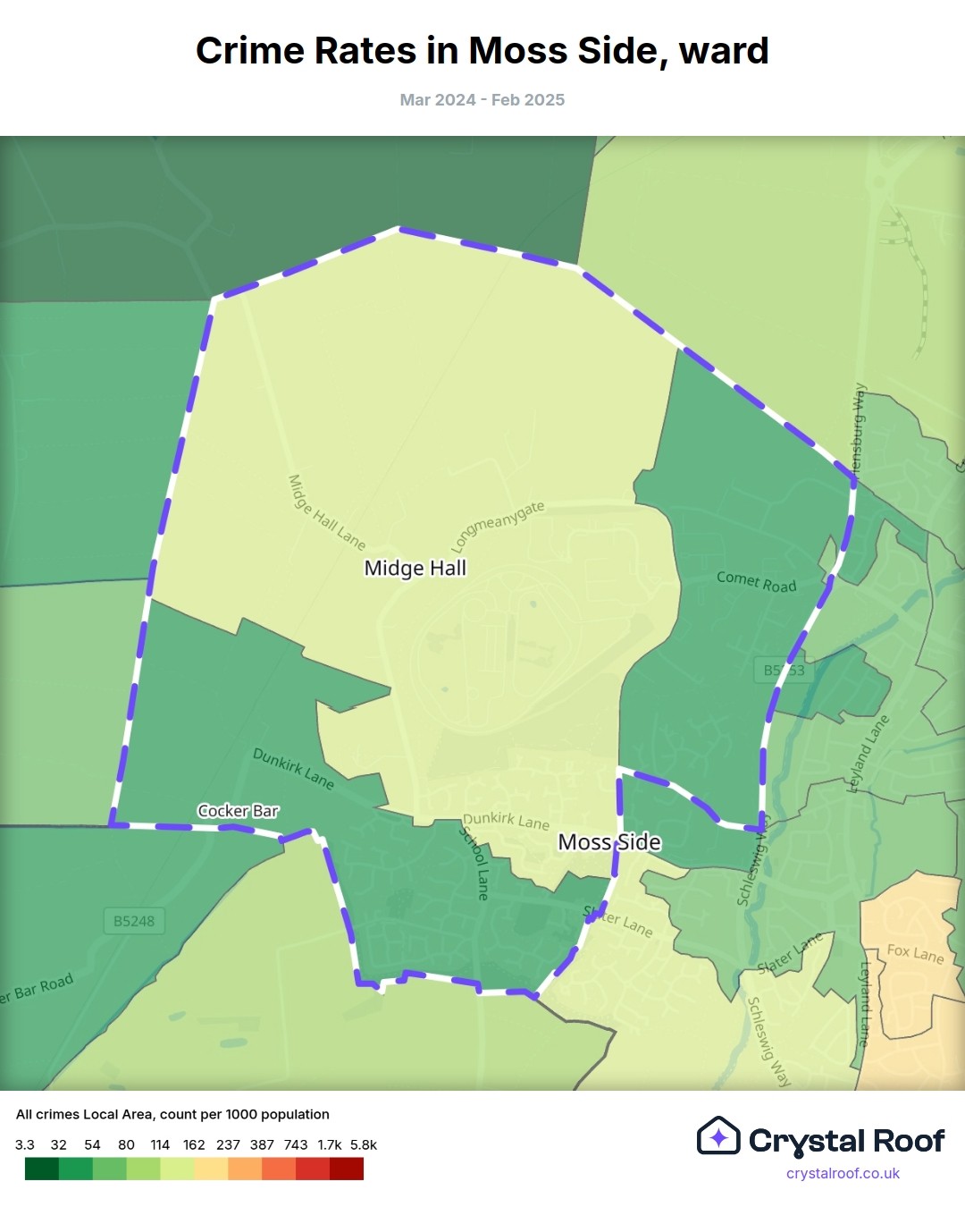 Moss Side (ward) is located within South Ribble (borough). Annual total crime rate in South Ribble (borough) is 87.8 crimes per thousand resident population, which can be rated as 4 out of 10 or low crime level compared to other local authority districts in England and Wales.