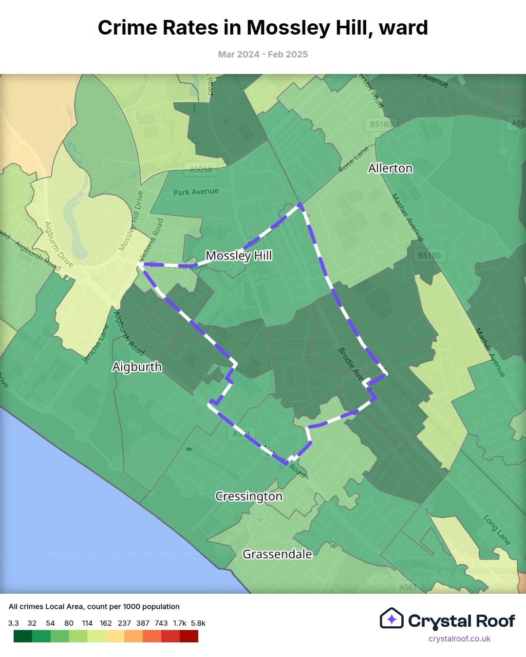 Mossley Hill, (ward) includes areas with the following crime ratings (see map):