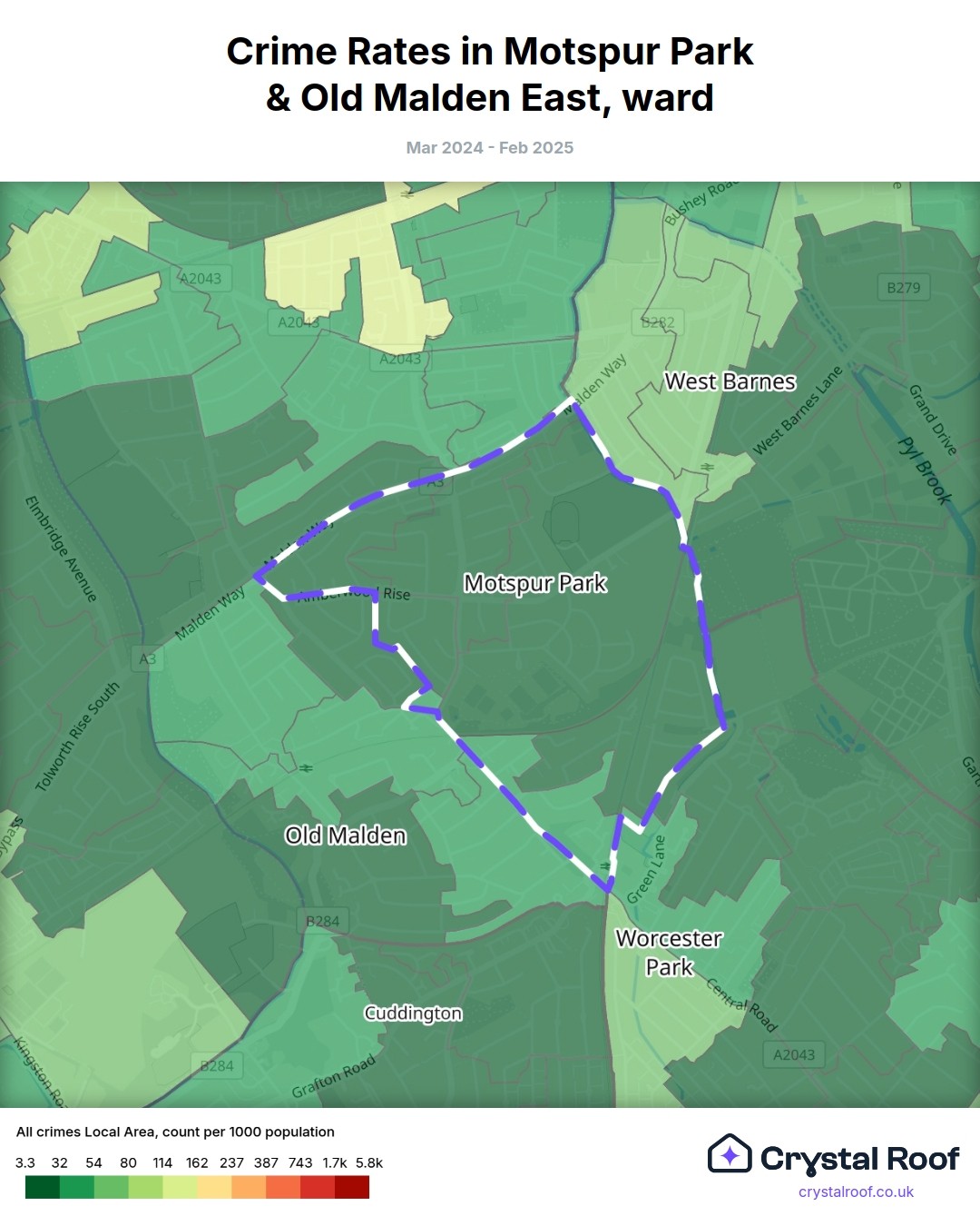 Motspur Park & Old Malden East, (ward) includes areas with the following crime ratings (see map):