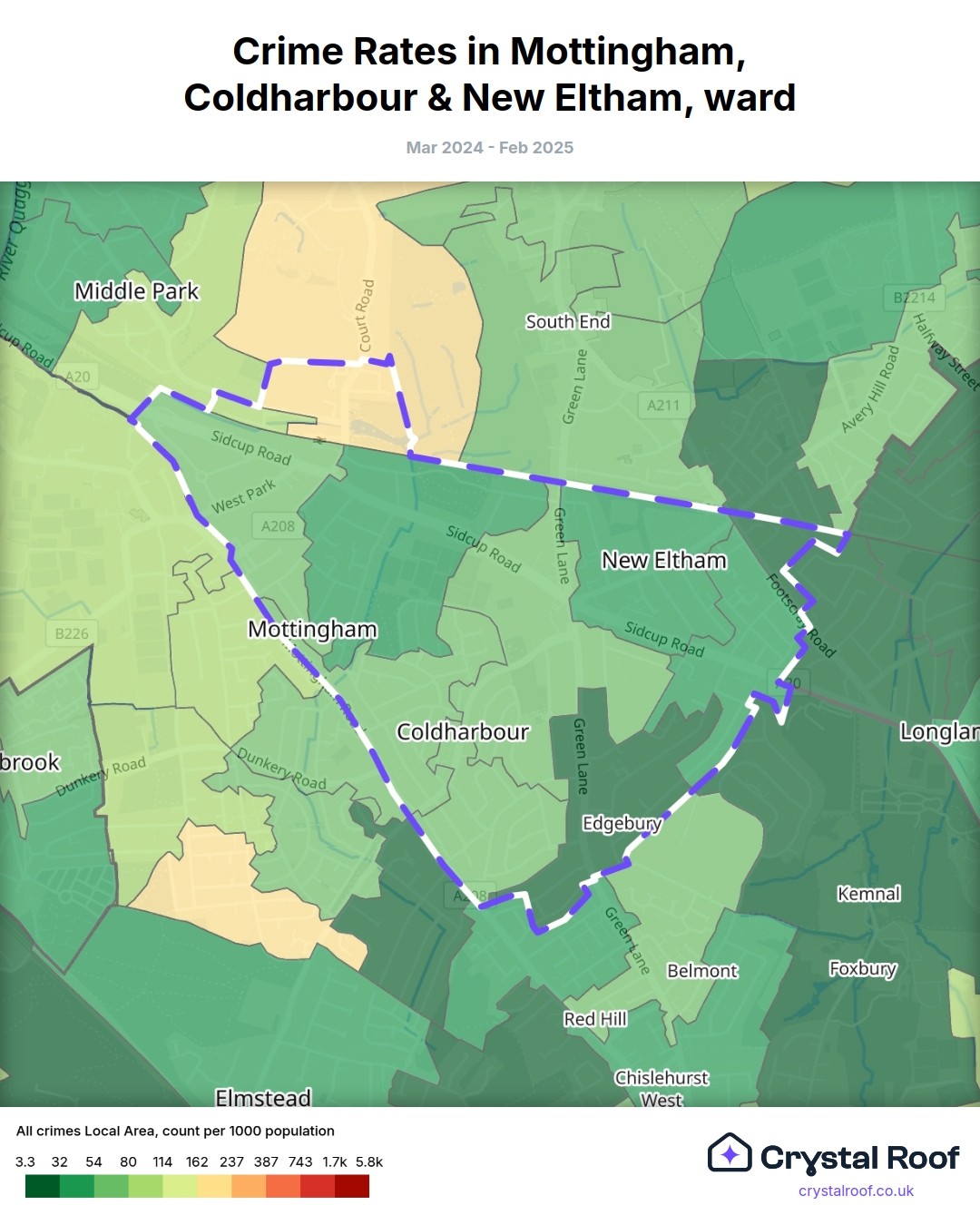 Mottingham, Coldharbour & New Eltham, (ward) includes areas with the following crime ratings (see map):