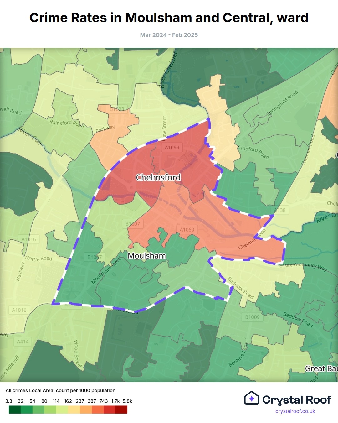 Moulsham and Central, (ward) includes areas with the following crime ratings (see map):