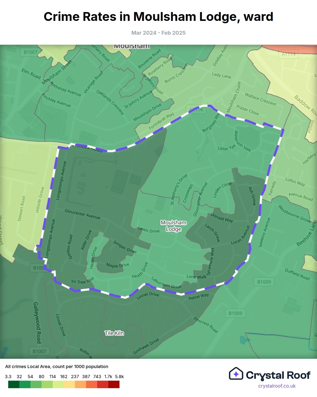 Moulsham Lodge, (ward) includes areas with the following crime ratings (see map):