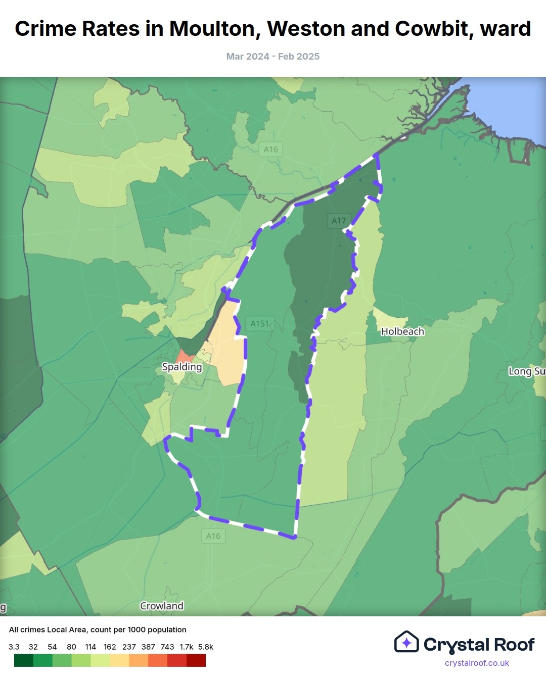 Moulton, Weston and Cowbit, (ward) includes areas with the following crime ratings (see map):