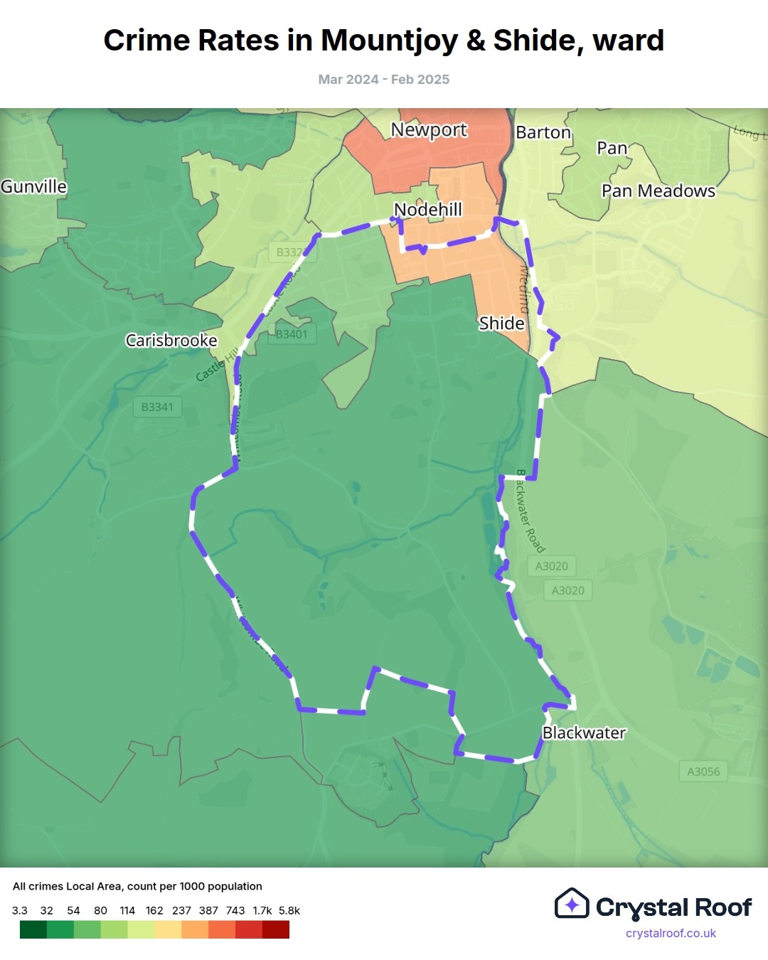 Mountjoy & Shide (ward) is located within Isle of Wight (borough). Annual total crime rate in Isle of Wight (borough) is 84.9 crimes per thousand resident population, which can be rated as 3 out of 10 or low crime level compared to other local authority districts in England and Wales.