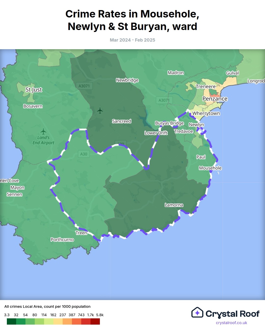 Mousehole, Newlyn & St Buryan, (ward) includes areas with the following crime ratings (see map):