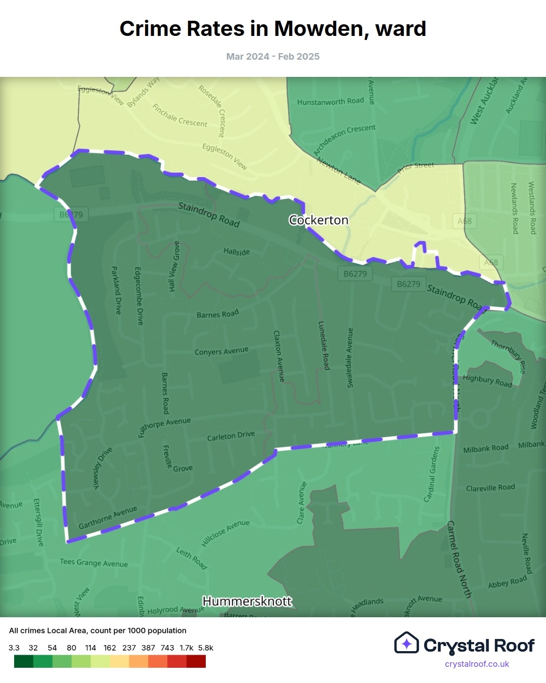 Mowden, (ward) includes areas with the following crime ratings (see map):