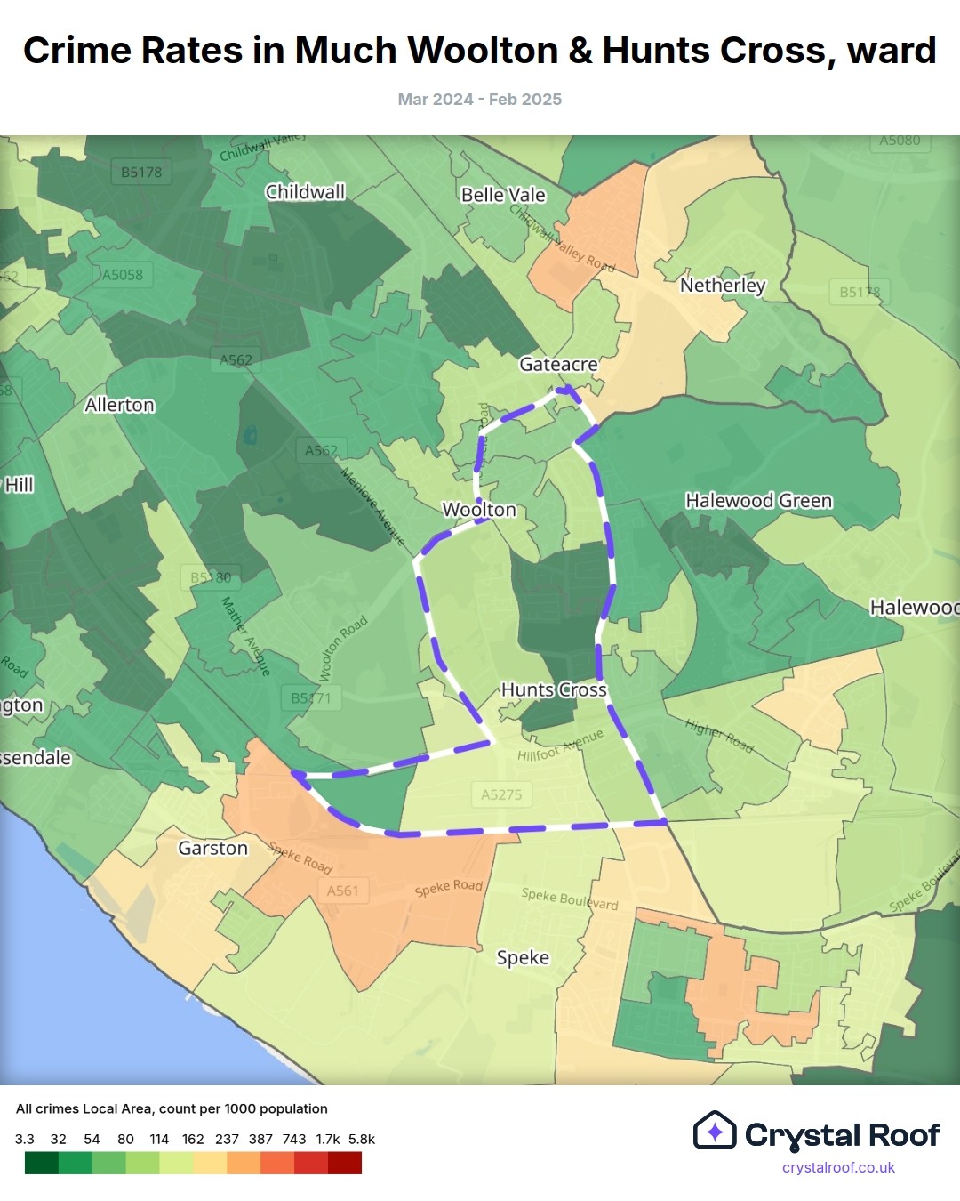 Much Woolton & Hunts Cross, (ward) includes areas with the following crime ratings (see map):