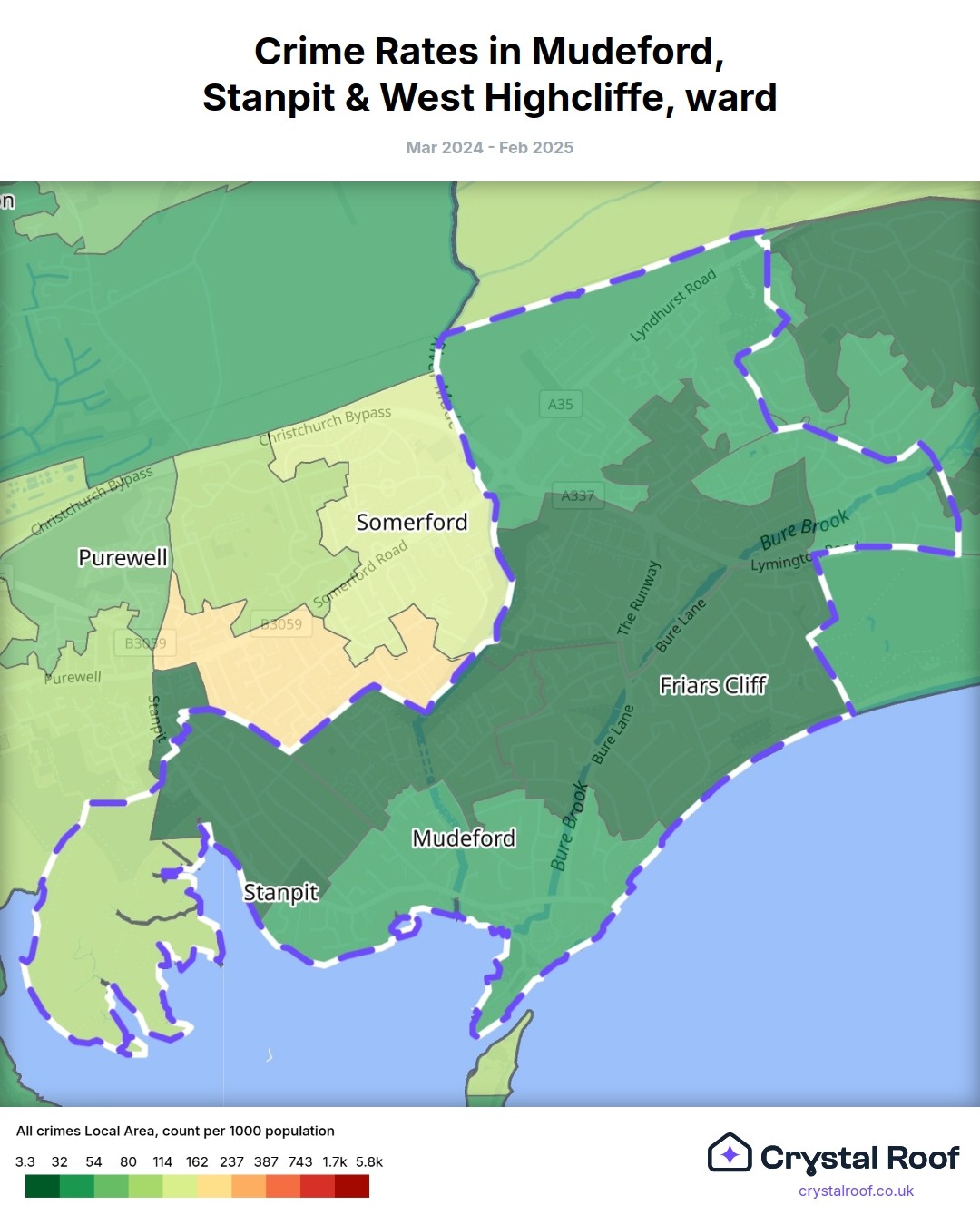 Mudeford, Stanpit & West Highcliffe, (ward) includes areas with the following crime ratings (see map):