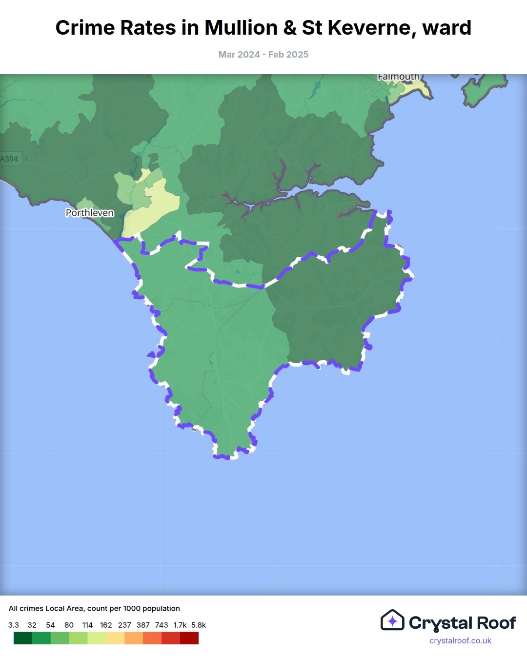 Mullion & St Keverne, (ward) includes areas with the following crime ratings (see map):