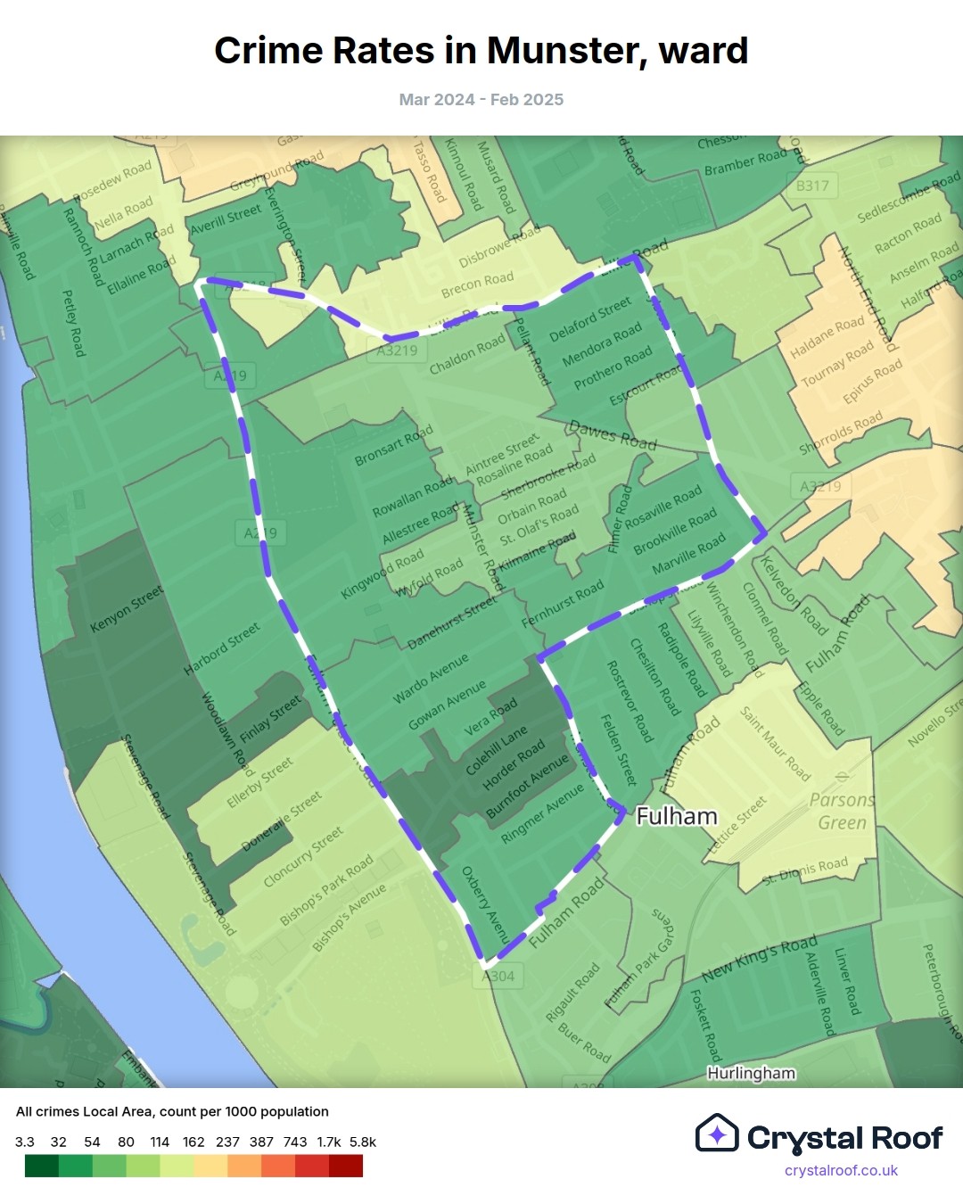 Munster (ward) is located within Hammersmith and Fulham (borough). Annual total crime rate in Hammersmith and Fulham (borough) is 147 crimes per thousand resident population, which can be rated as 7 out of 10 or high crime level compared to other local authority districts in England and Wales.