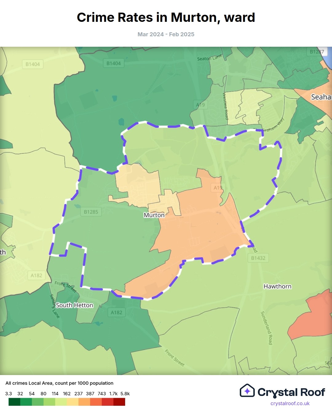 The figures in grey indicate the relative ratings of Murton (ward) for a specific crime type compared to other wards in England and Wales.