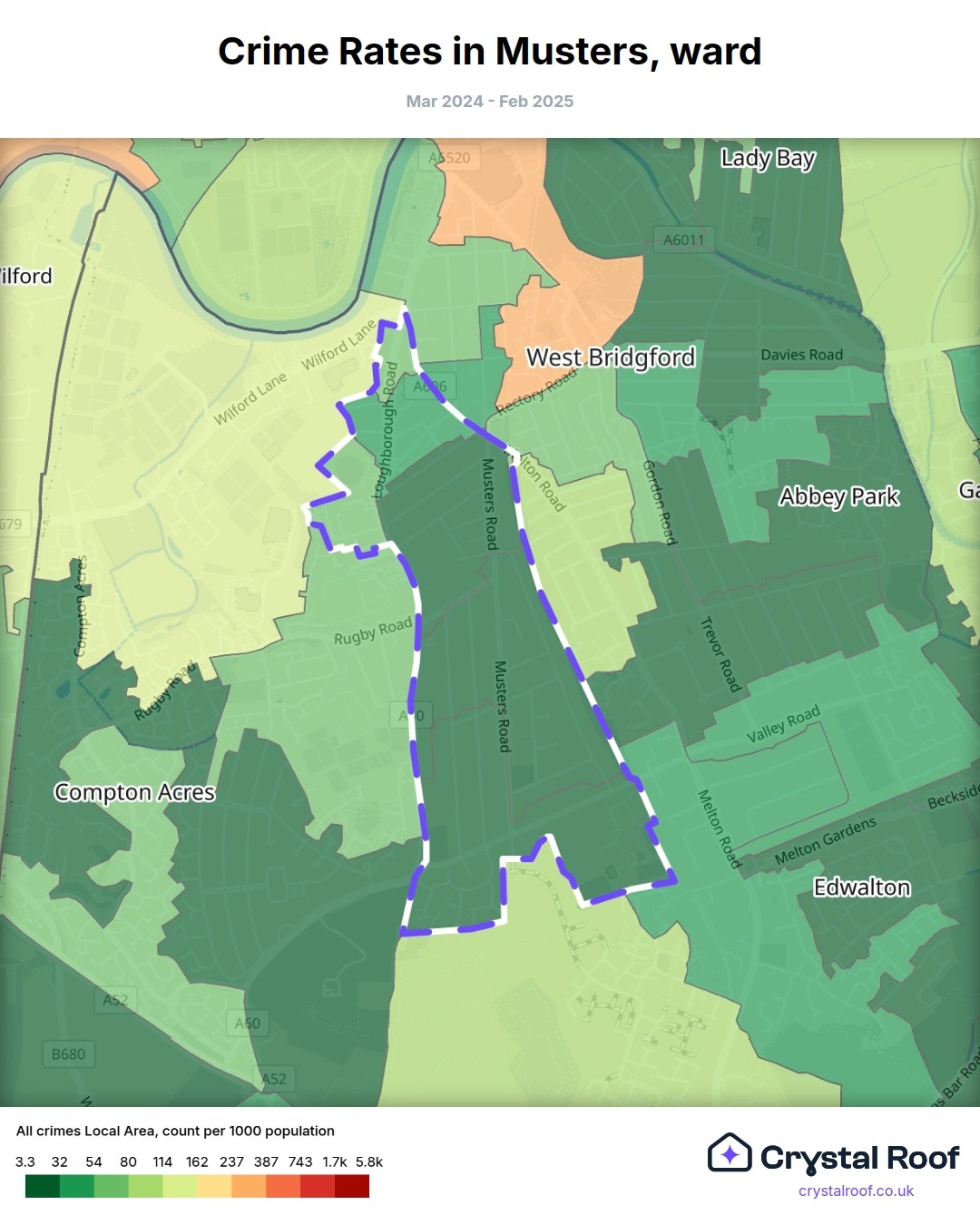 Musters, (ward) includes areas with the following crime ratings (see map):