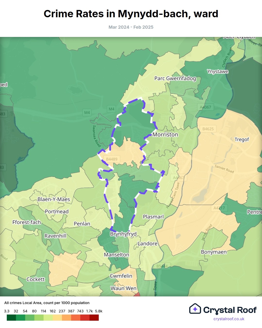 The figures in grey indicate the relative ratings of Mynydd-bach (ward) for a specific crime type compared to other wards in England and Wales.