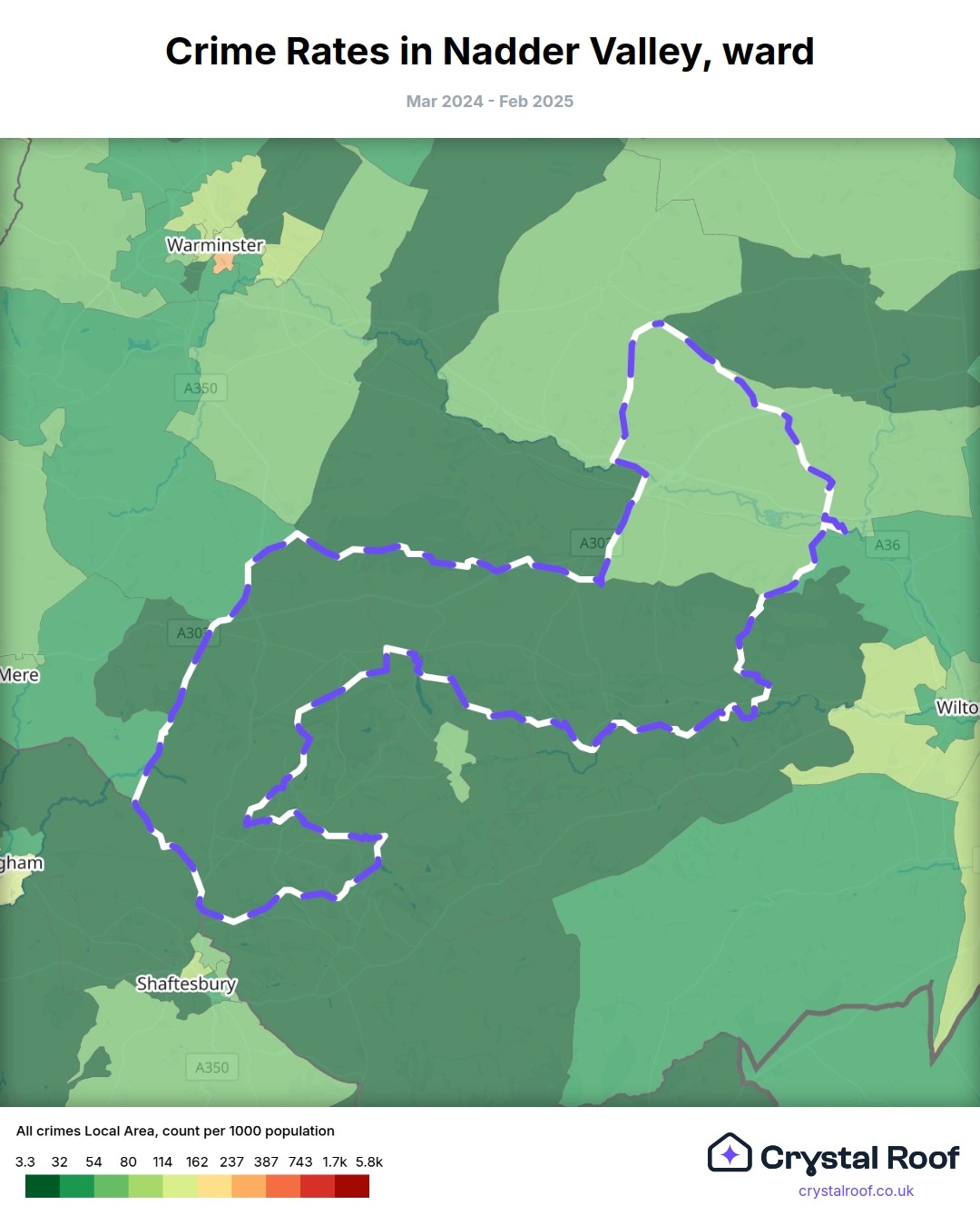 Nadder Valley, (ward) includes areas with the following crime ratings (see map):