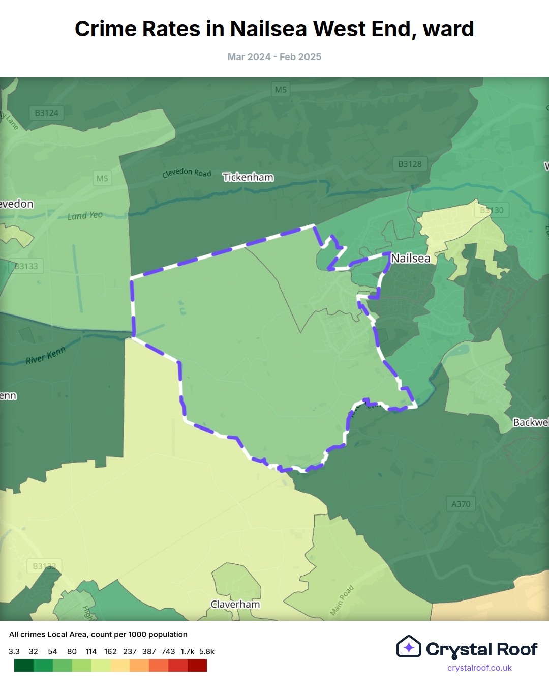 Nailsea West End, (ward) includes areas with the following crime ratings (see map):