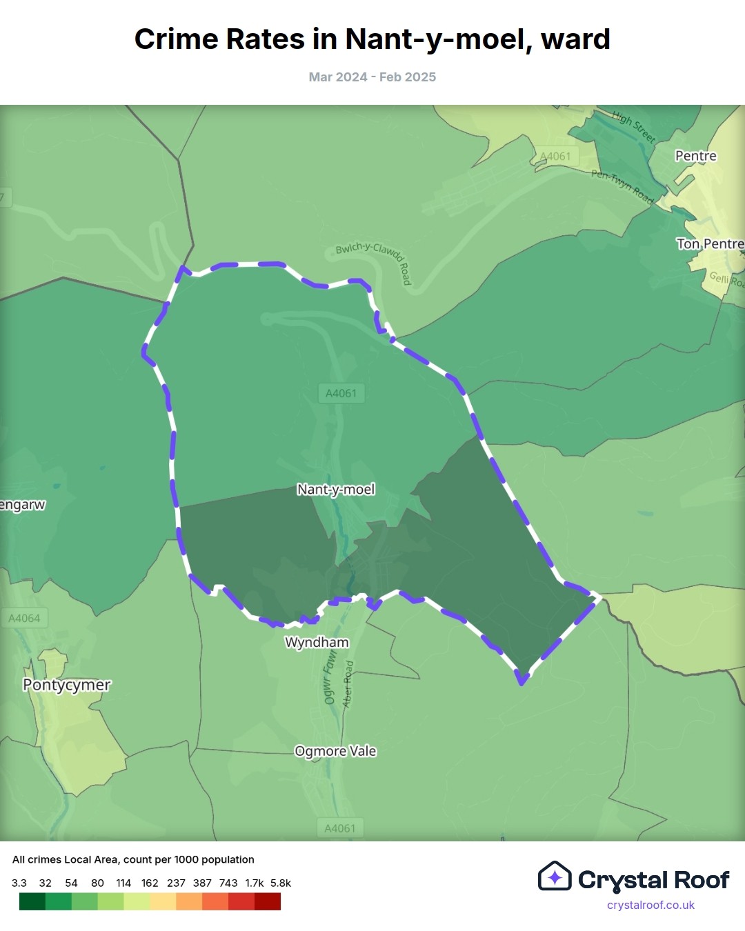 The figures in grey indicate the relative ratings of Nant-y-moel (ward) for a specific crime type compared to other wards in England and Wales.