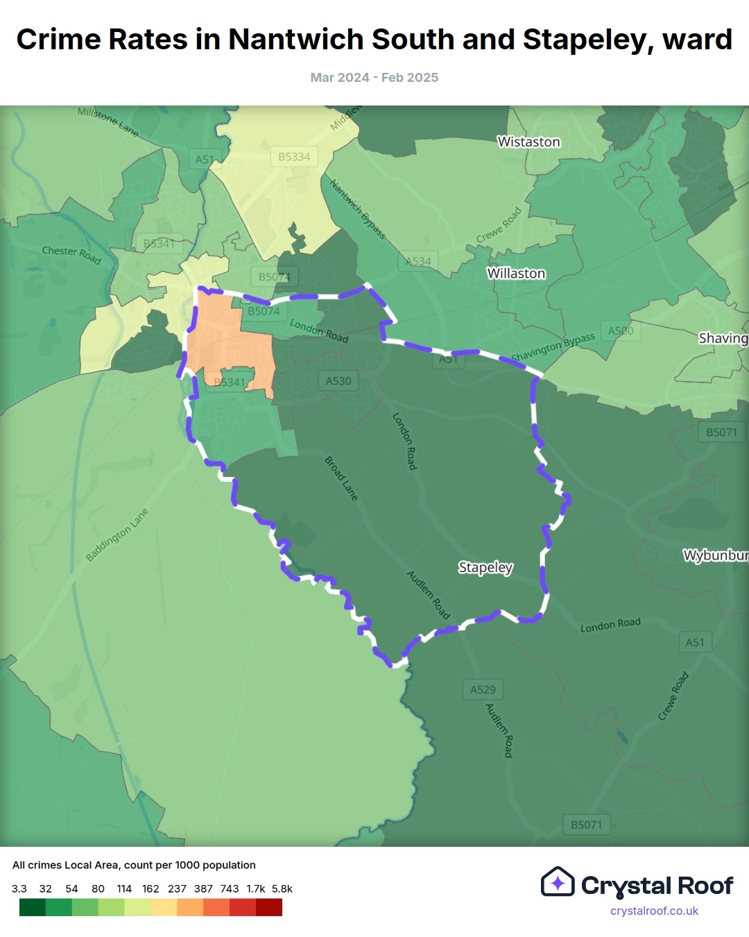 Nantwich South and Stapeley, (ward) includes areas with the following crime ratings (see map):