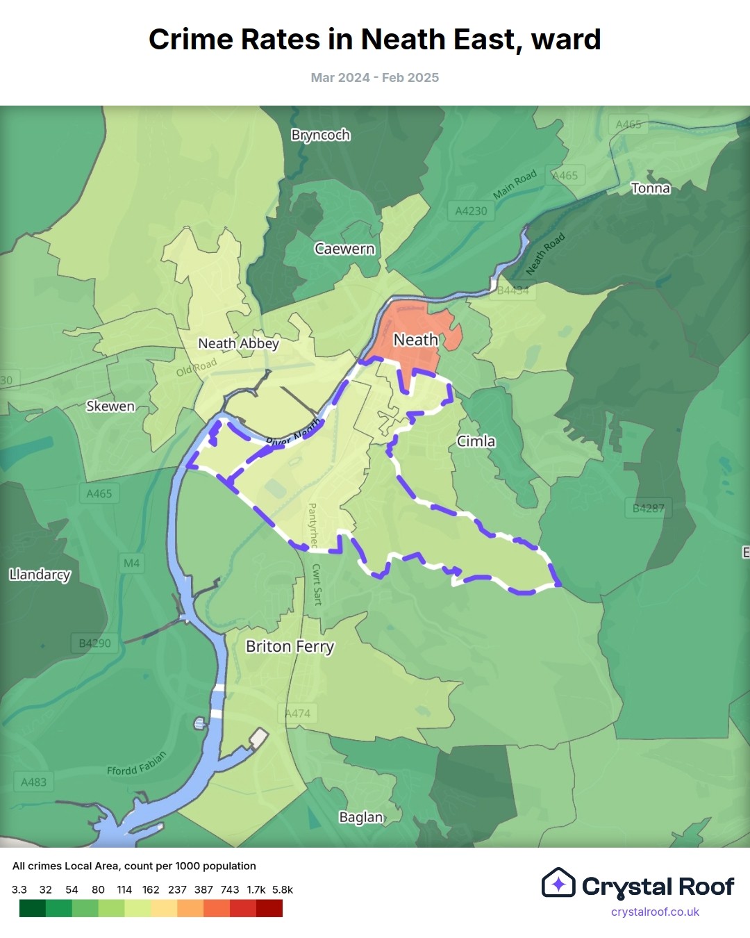 The figures in grey indicate the relative ratings of Neath East (ward) for a specific crime type compared to other wards in England and Wales.