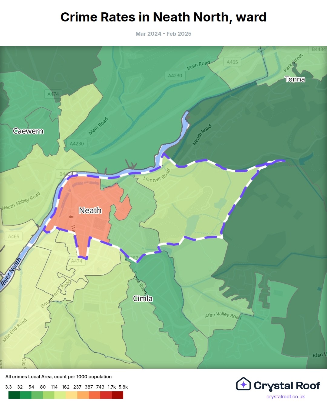 The figures in grey indicate the relative ratings of Neath North (ward) for a specific crime type compared to other wards in England and Wales.