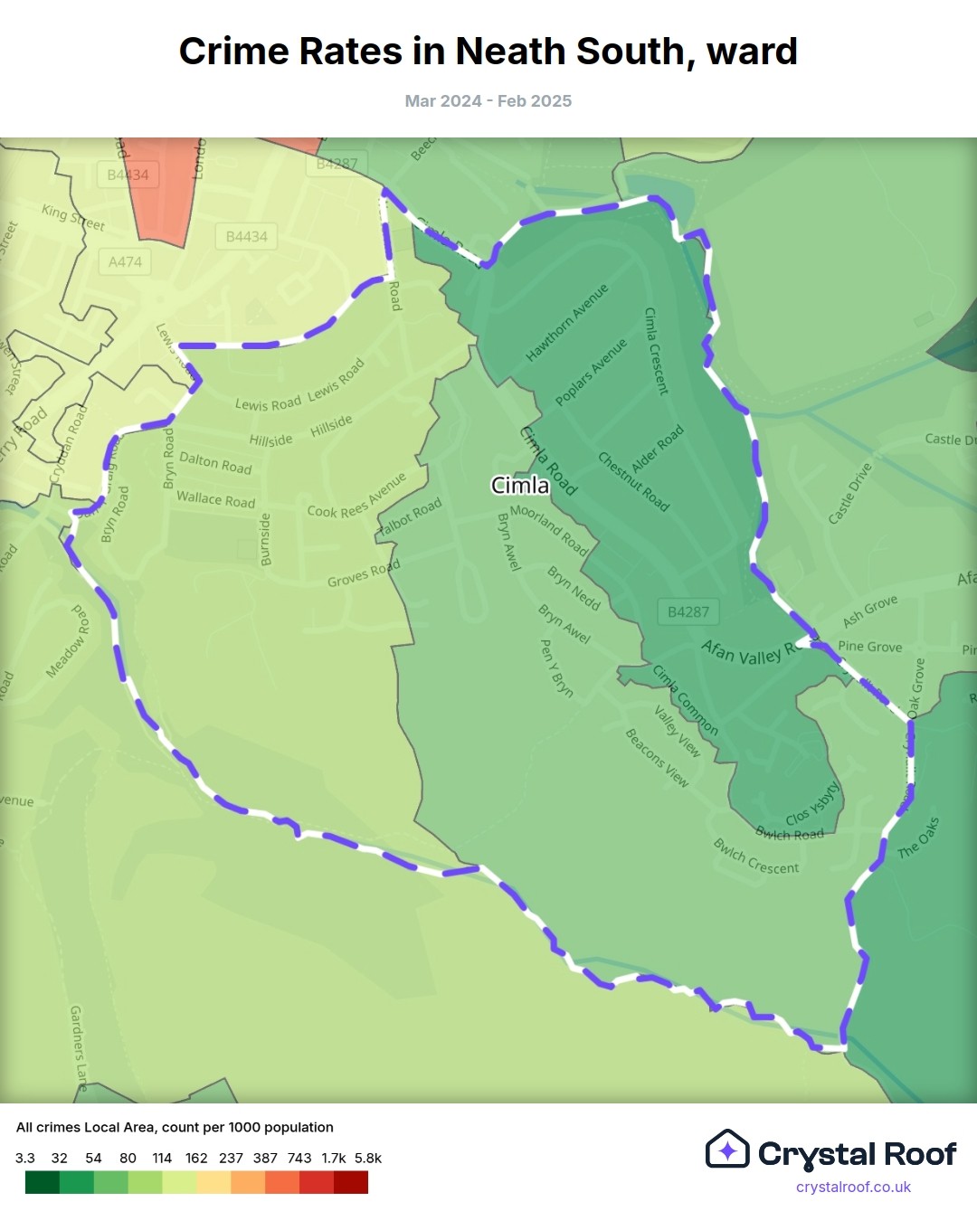 The figures in grey indicate the relative ratings of Neath South (ward) for a specific crime type compared to other wards in England and Wales.