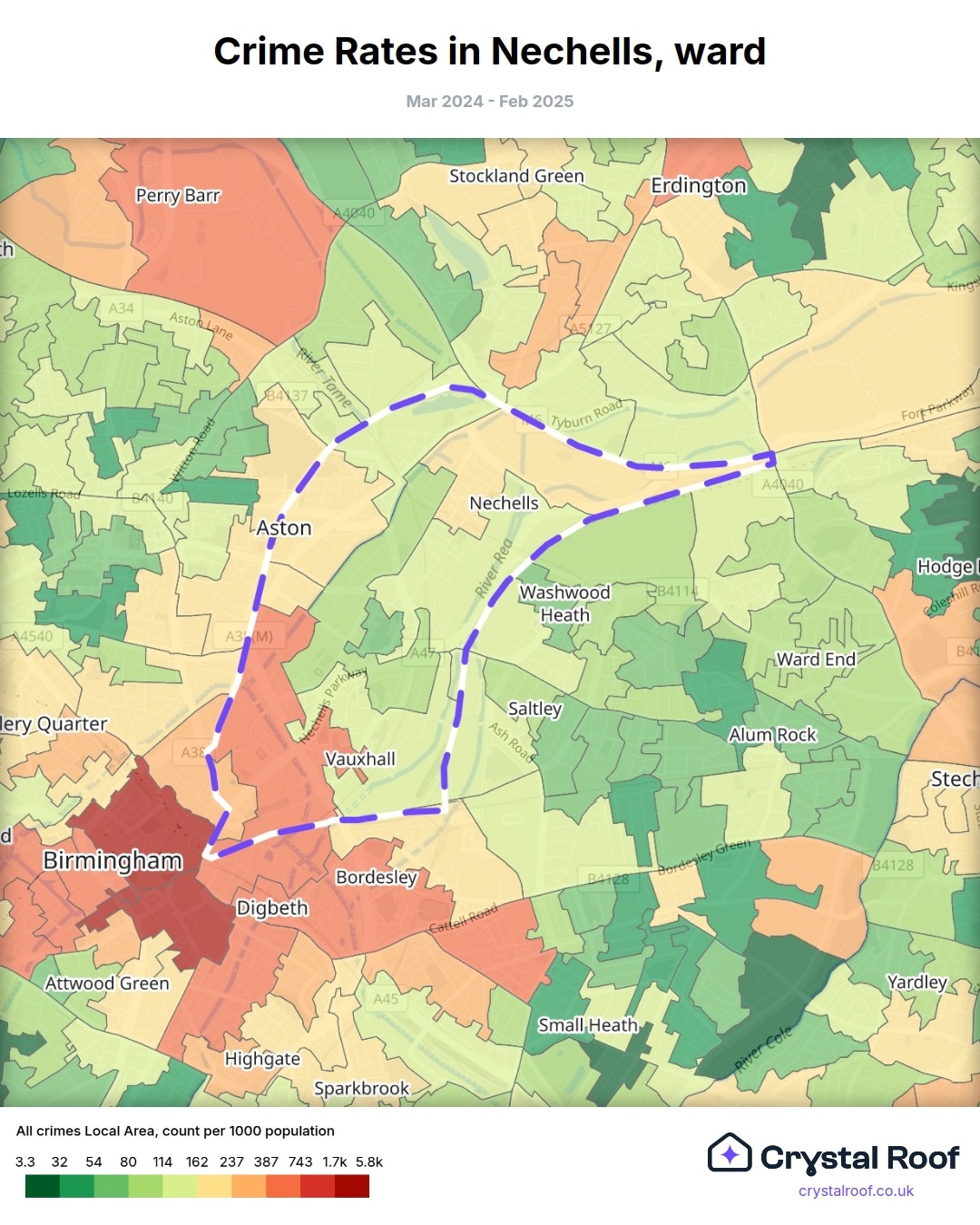 The figures in grey indicate the relative ratings of Nechells (ward) for a specific crime type compared to other wards in England and Wales.
