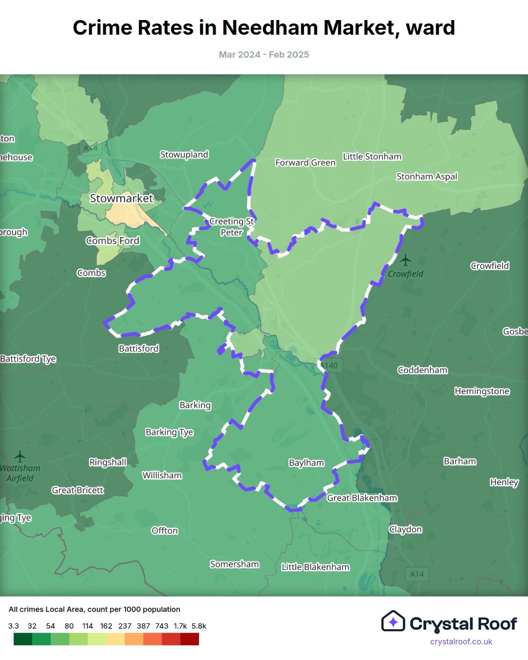 Needham Market, (ward) includes areas with the following crime ratings (see map):