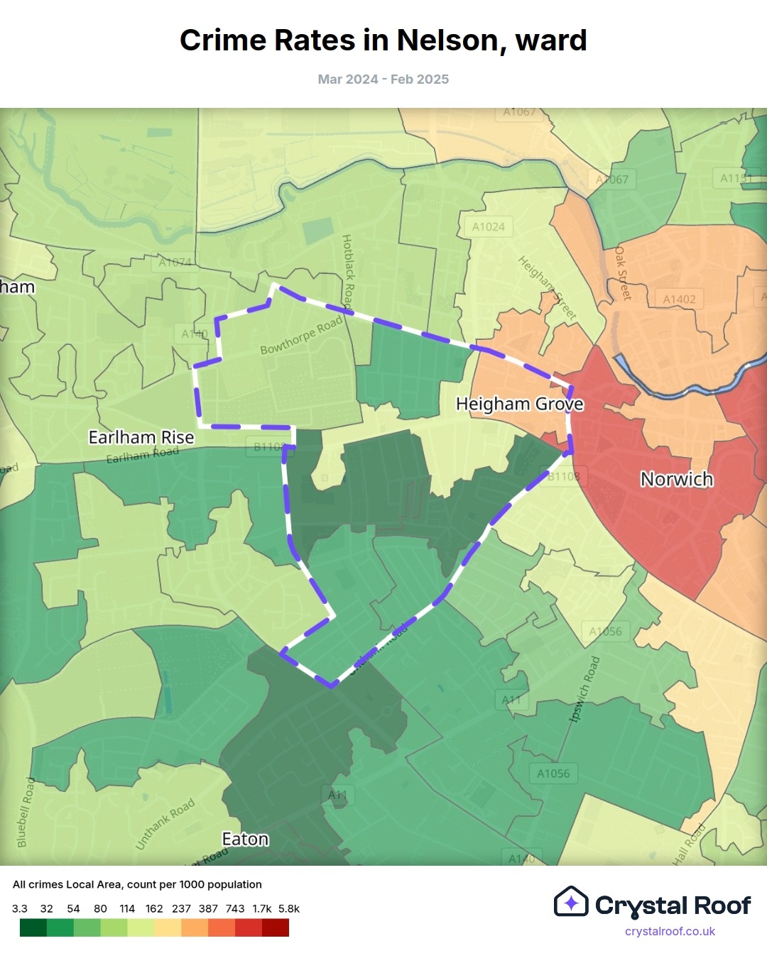 Nelson (ward) is located within Norwich (borough). Annual total crime rate in Norwich (borough) is 131 crimes per thousand resident population, which can be rated as 6 out of 10 or medium crime level compared to other local authority districts in England and Wales.