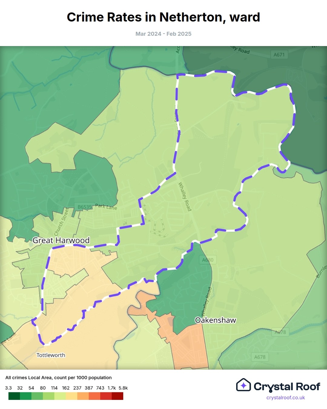 Netherton (ward) is located within Hyndburn (borough). Annual total crime rate in Hyndburn (borough) is 141 crimes per thousand resident population, which can be rated as 7 out of 10 or high crime level compared to other local authority districts in England and Wales.
