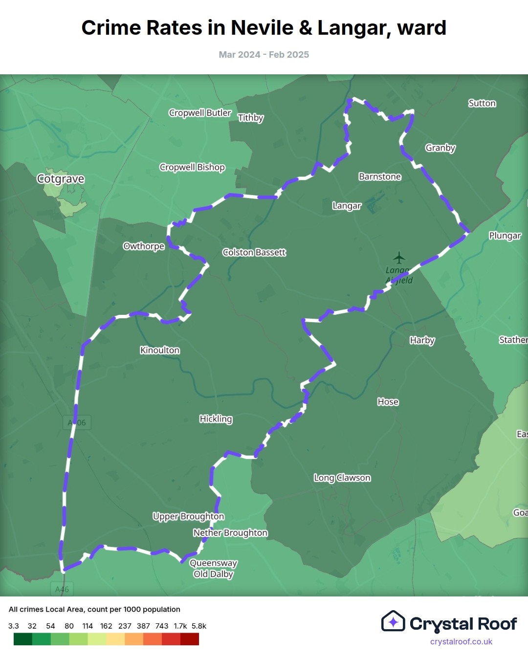 Nevile & Langar, (ward) includes areas with the following crime ratings (see map):