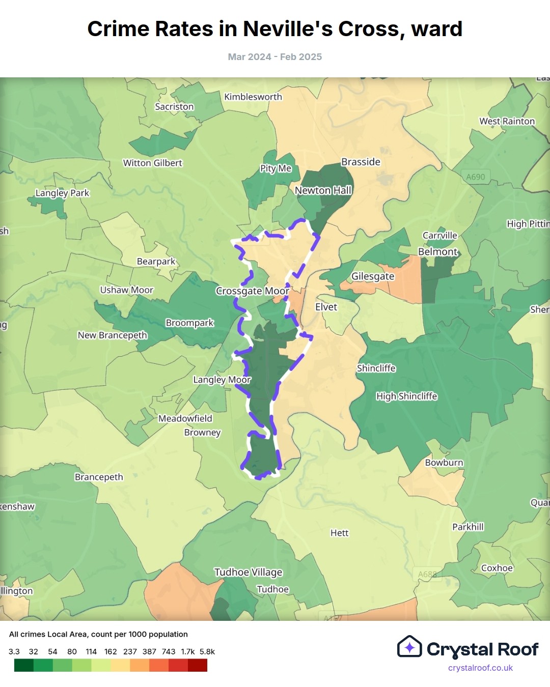 Neville's Cross, (ward) includes areas with the following crime ratings (see map):