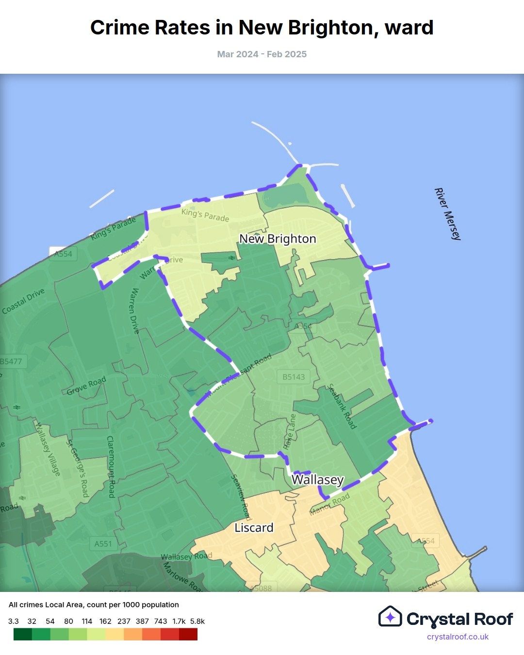 The figures in grey indicate the relative ratings of New Brighton (ward) for a specific crime type compared to other wards in England and Wales.