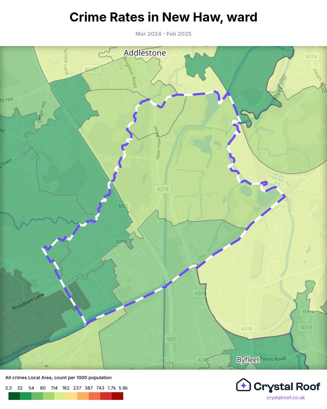 The figures in grey indicate the relative ratings of New Haw (ward) for a specific crime type compared to other wards in England and Wales.