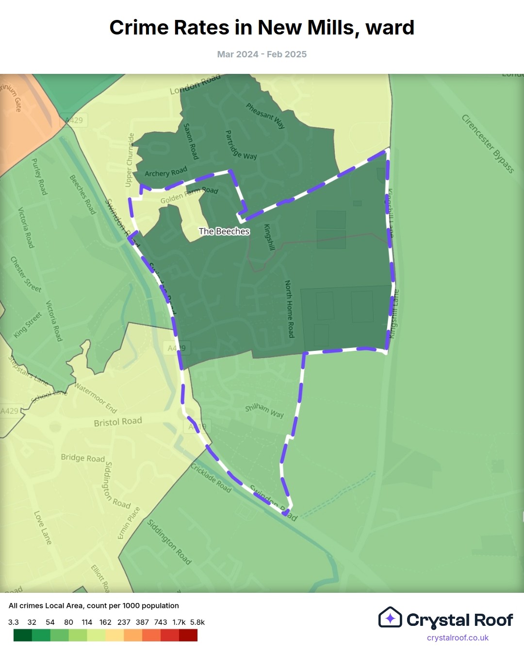New Mills (ward) is located within Cotswold (borough). Annual total crime rate in Cotswold (borough) is 58.6 crimes per thousand resident population, which can be rated as 2 out of 10 or low crime level compared to other local authority districts in England and Wales.