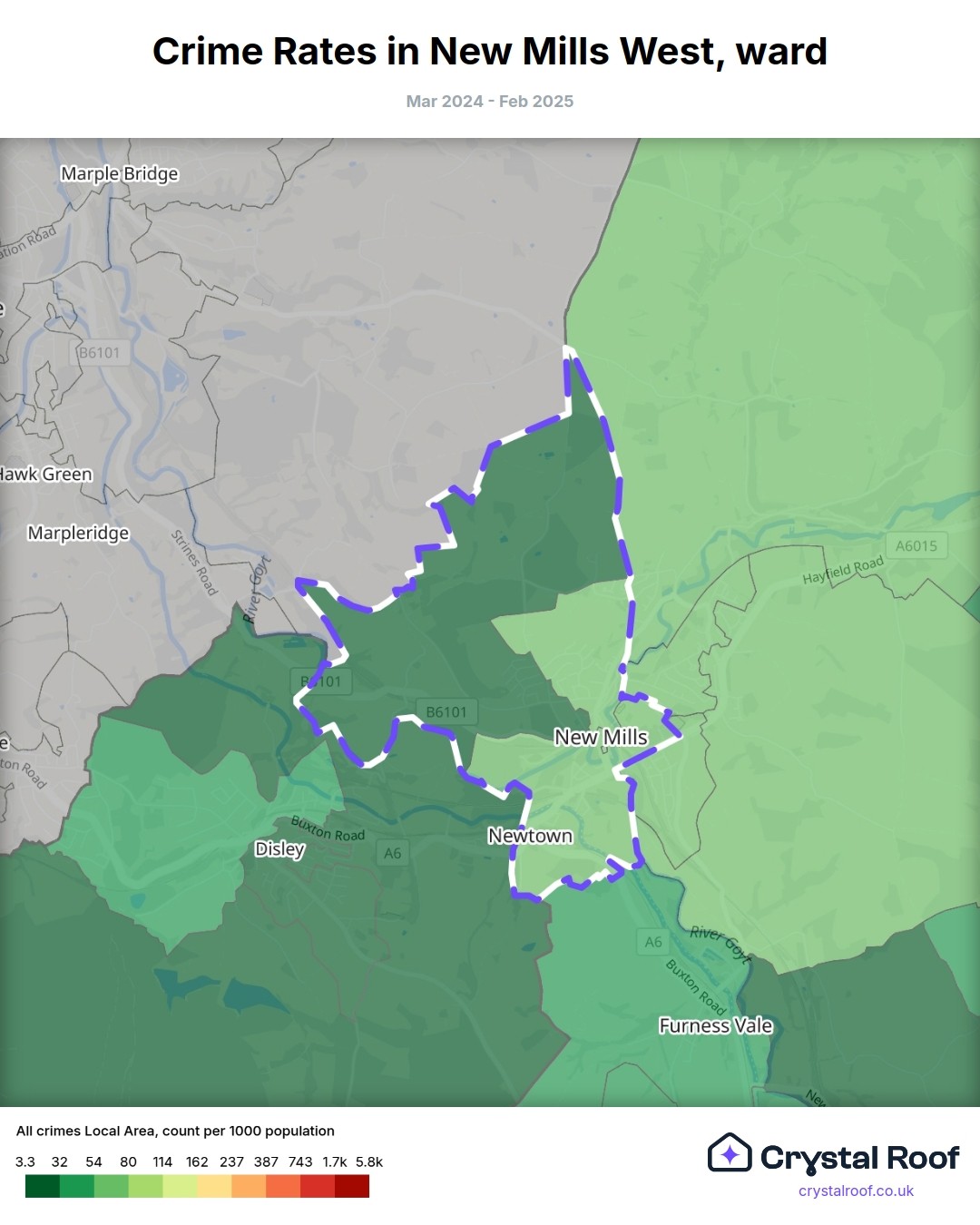 New Mills West, (ward) includes areas with the following crime ratings (see map):