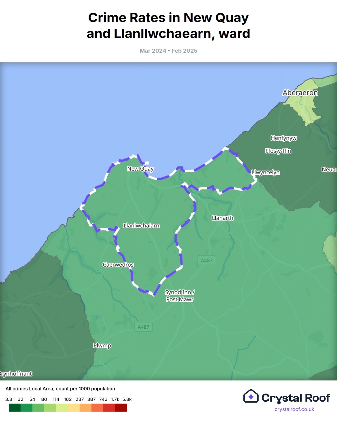 New Quay and Llanllwchaearn, (ward) includes areas with the following crime ratings (see map):