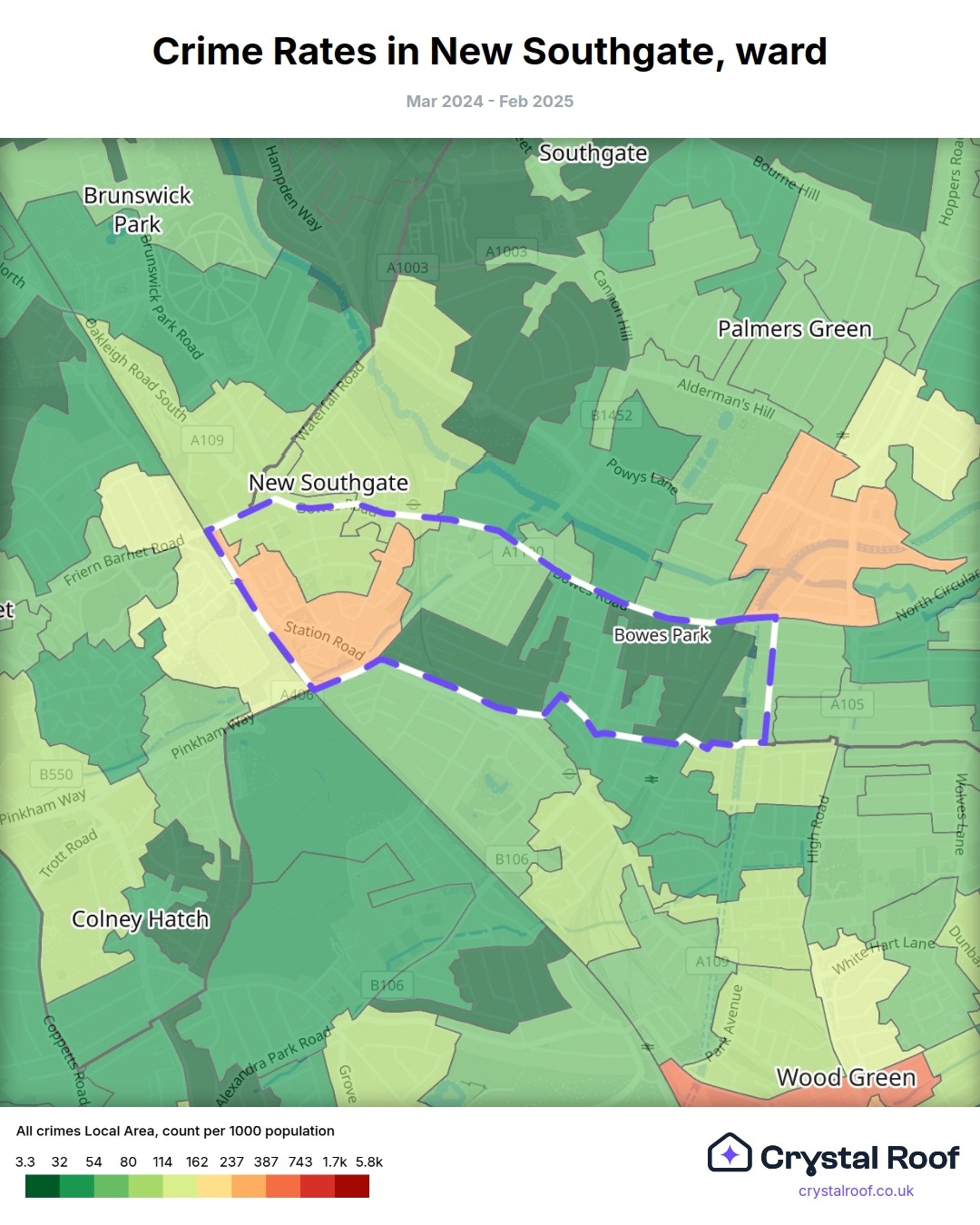 The figures in grey indicate the relative ratings of New Southgate (ward) for a specific crime type compared to other wards in England and Wales.